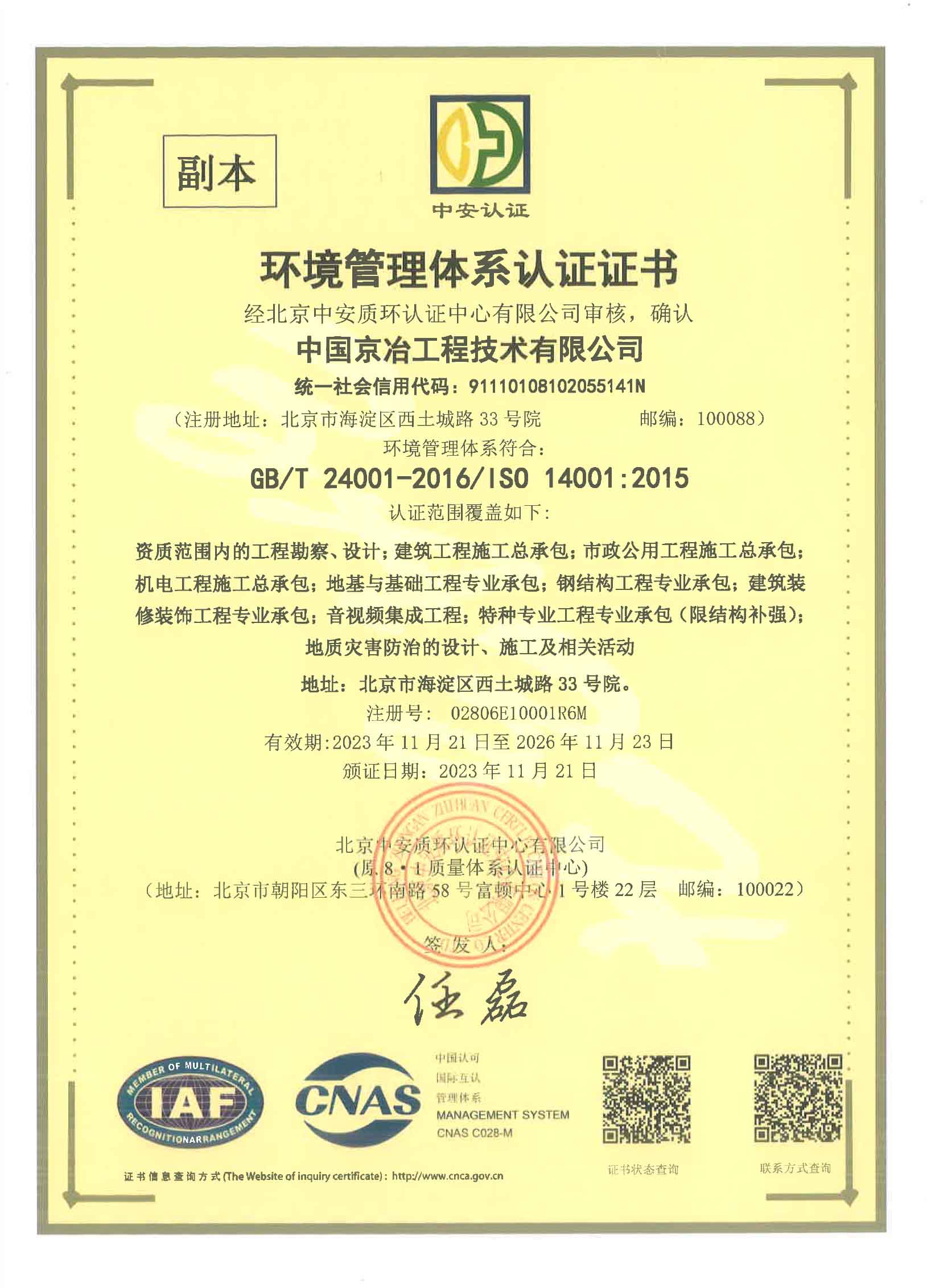 環境管理體系認證證書