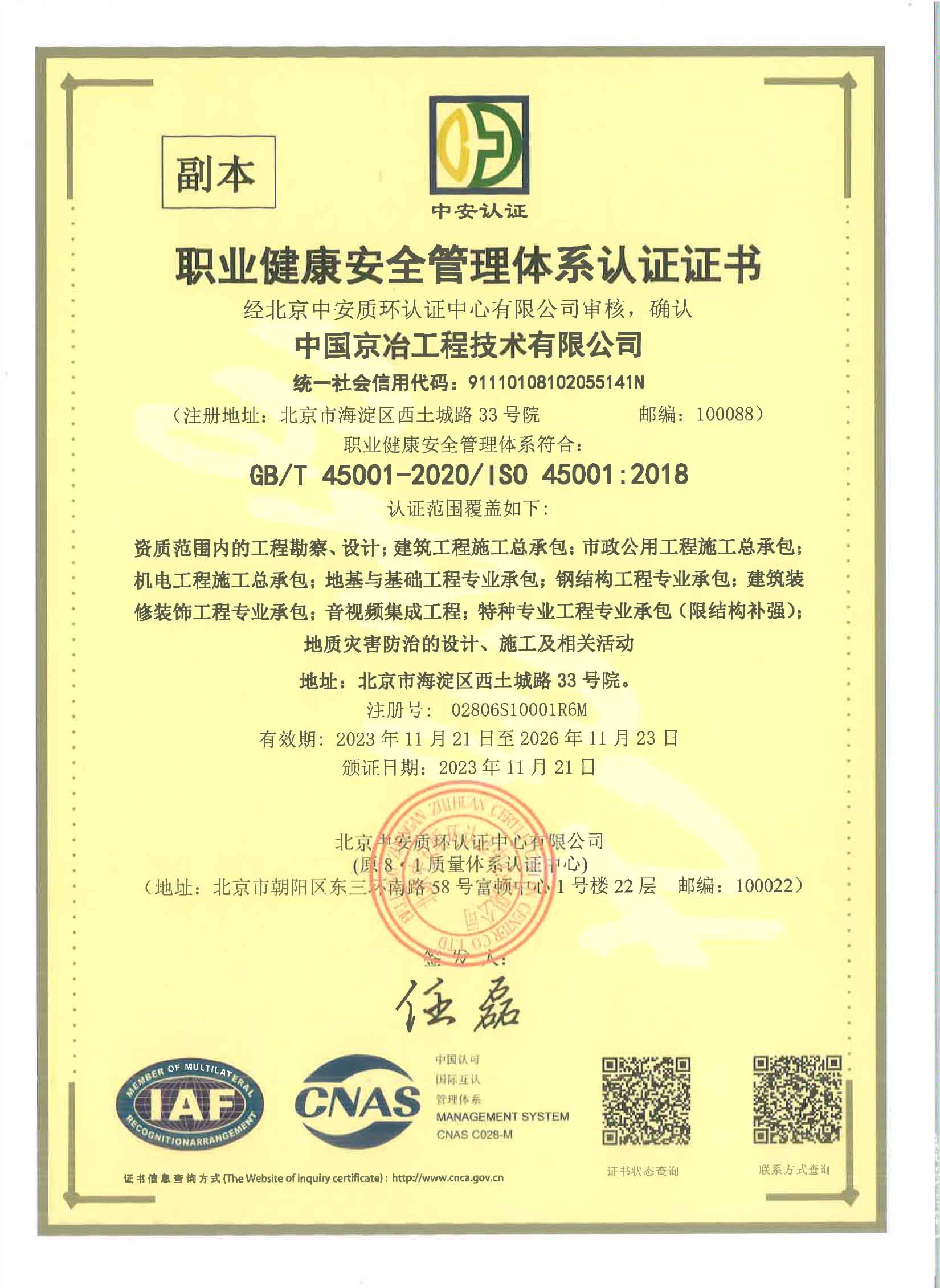 職業健康安全管理體系認證證書